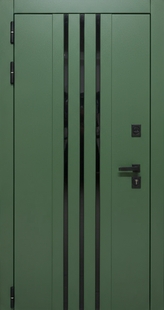 Входная дверь с реечным дизайном и тонированным стеклом (панели MDF RAL 6009) КД-1305